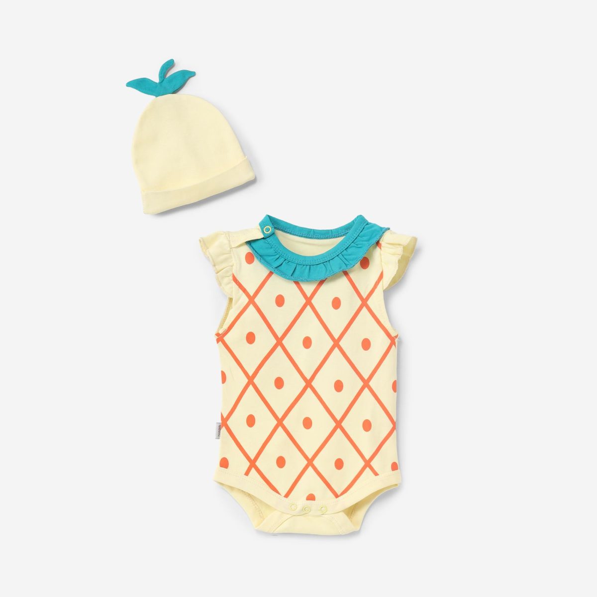الطاقية تُكمل الإطلالة وتحمل نفس تصميم أو لون الأناناس، سواء كانت قبعة شمس واسعة أو قبعة بيسبول عصرية. صُنع الطقم من خامات صيفية خفيفة ومريحة مثل القطن.