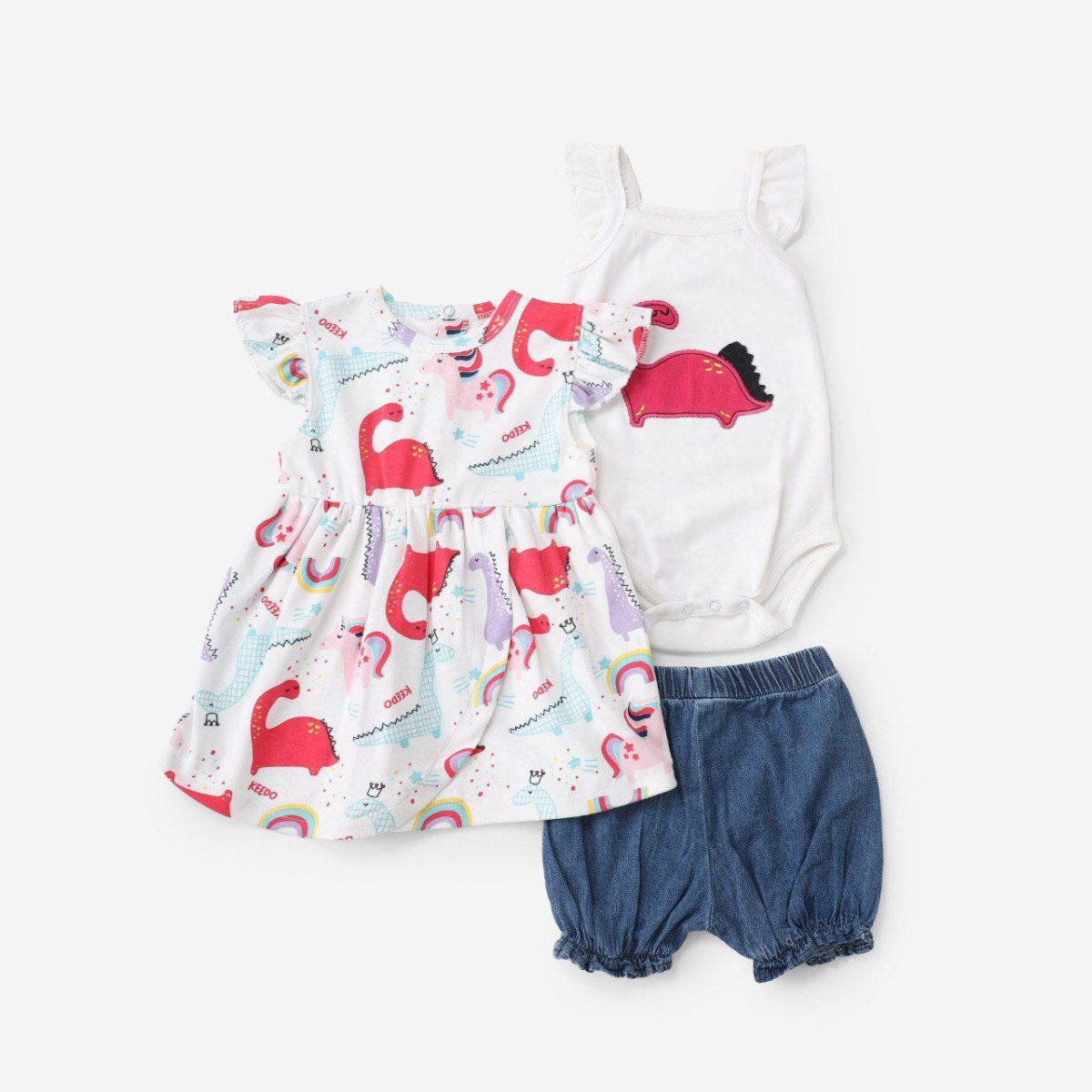 تُكمل المجموعة قطعة ثالثة ممتعة قد تكون سترة خفيفة، أو قبعة بتصميم ديناصور، أو منديل مرح. صُنع الطقم من خامات ناعمة ومريحة مثل القطن ليضمن راحة طفلك أثناء اللعب.